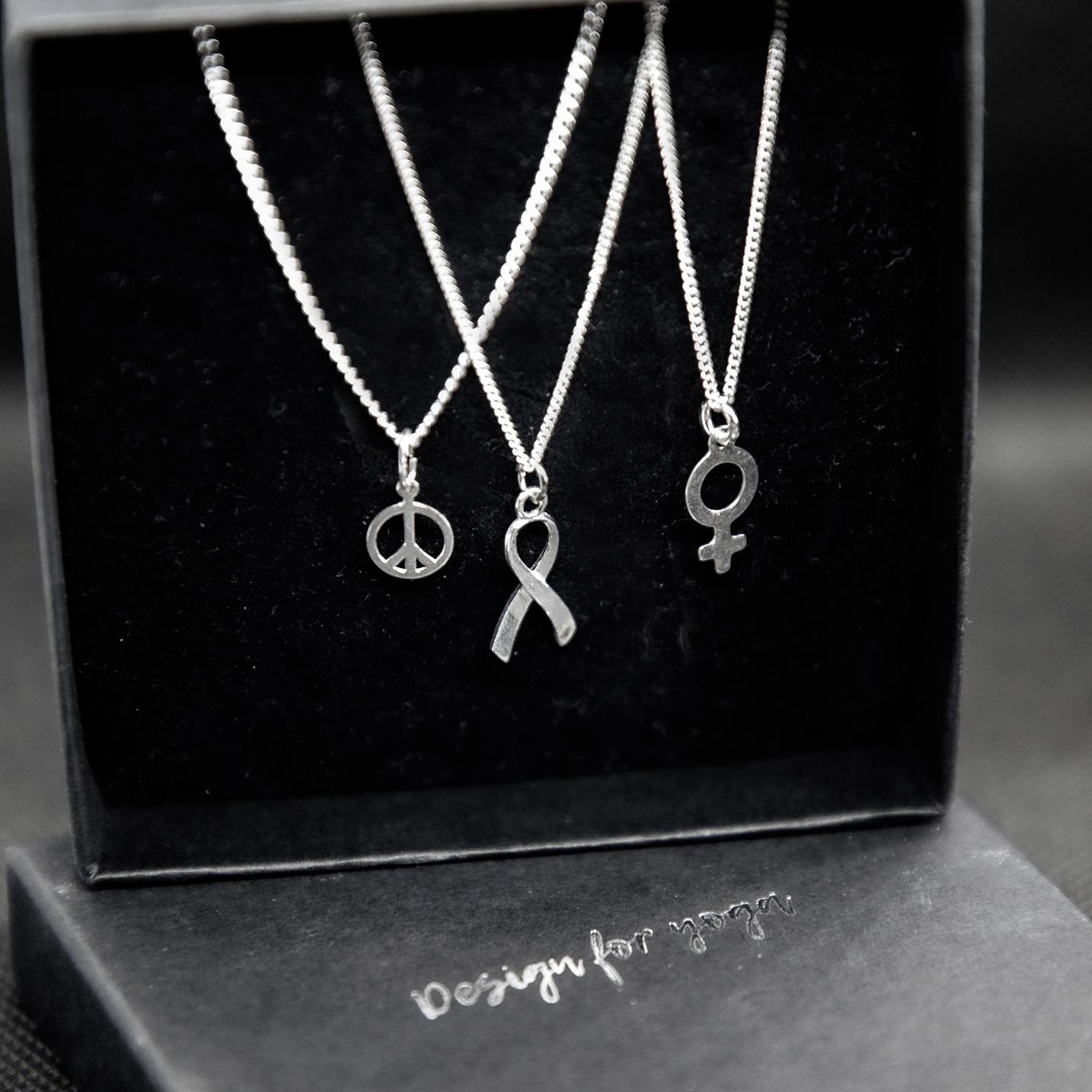 Silverkedja med olika hängen. Peace, Rosa bandet eller kvinnotecknet.